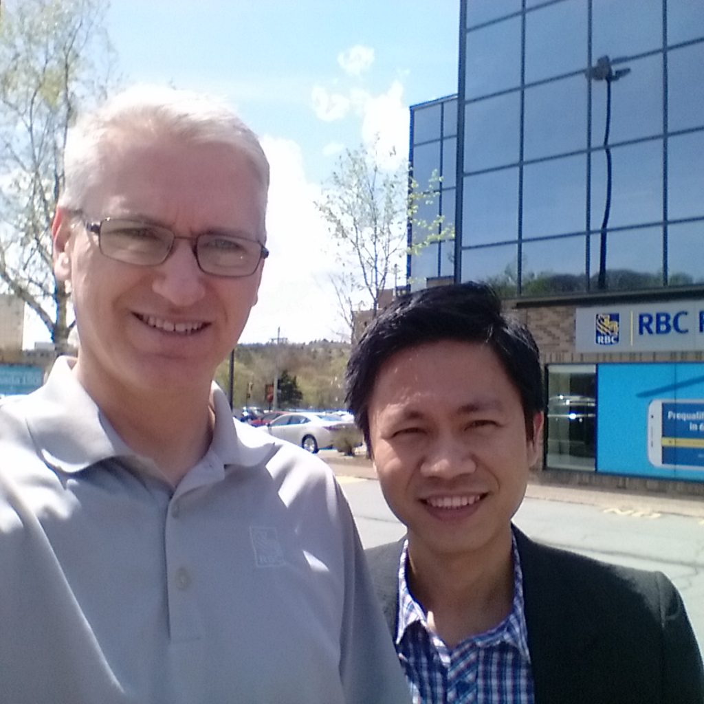 Craig Bannon and Kevin Nguyen outside the RBC branch in Bedford where Kevin started working as a Banking Advisor.